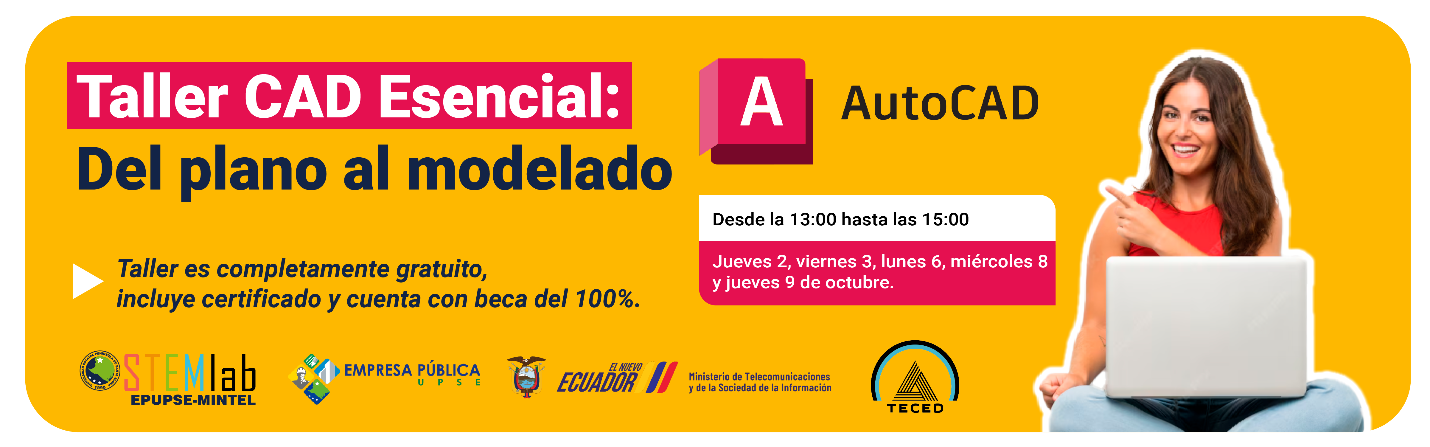 El taller de AutoCAD se llevará a cabo en las instalaciones de la Universidad Estatal de la Península de Santa Elena, en los laboratorios de informática, y contará con un programa estructurado en varias sesiones, orientadas a fortalecer las competencias en diseño y dibujo técnico asistido por computadora mediante la práctica y la experimentación. Se creará un grupo para mantener a los participantes informados sobre la fecha de início y otros detalles importantes. El horario será de 13:00 a 15:00 en las siguientes fechas: Jueves 2 de octubre de 2025, Viernes 3 de octubre de 2025, Lunes 6 de octubre de 2025, Miércoles 8 de octubre de 2025 y Jueves 9 de octubre de 2025. El taller es completamente gratuito, incluye certificado y cuenta con beca del 100%. Ubicación UPSE-laboratorio de informática 1 y 2. Enlace al canal de grupo de investigación TECED https://whatsapp.com/channel/0029VbBKHeYA89Ma2ABUGz0J